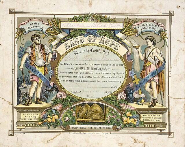 Band of Hope Temperance Society, Blenheim Blue Ribbon Branch. Published by Campbell and Tudhope, Glasgow, 1886. Alexander Turnbull Library, Wellington, New Zealand. Wikimedia Commons.